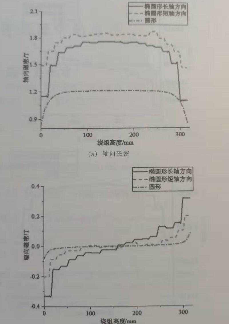 置與鐵心軸向平行,幾乎不發(fā)生彎曲,因此軸向磁較大,輻向磁密較小,但磁力線在繞組兩端發(fā)生曲,且越靠近端部彎曲情況越嚴(yán)重,因此軸向磁密在靠近繞組兩端時(shí)逐漸減小,而輻向磁密逐漸增大且方向相反
